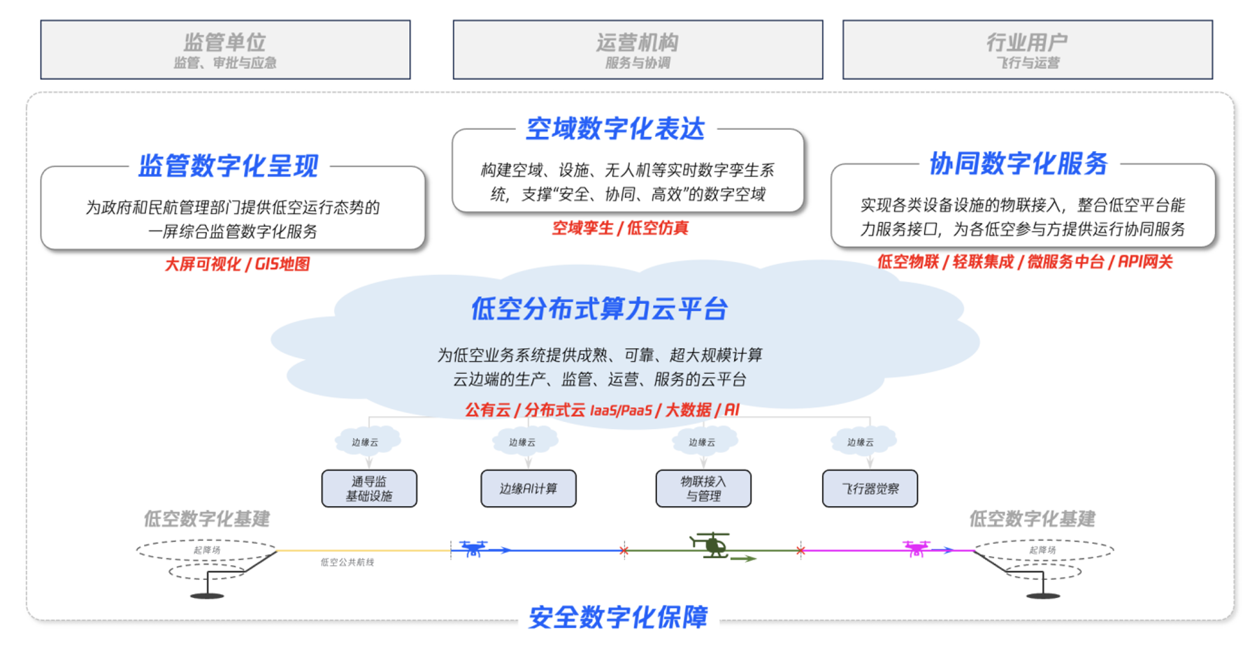 数字化的低空交通体系,底层需要有成熟、可靠、超大规模计算的云网边端分布式的算力平台的支撑,满足低空经济的生产、监管、运营、服务的智慧化运行要求。