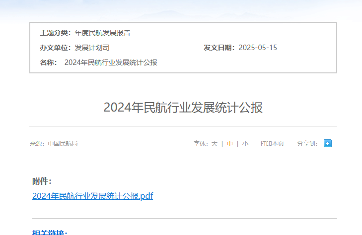 2025年05月15日,民航局发展计划司发布2024年民航行业发展统计公报。具体公告可文末扫码获取。