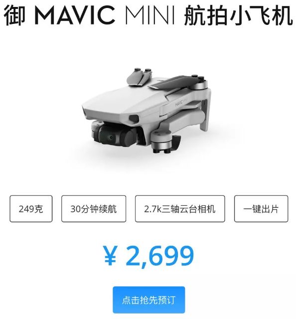 昨天晚上,大疆正式发布了御MavicMini航拍飞机,售价2699元,是大疆Mavic系列无机中价格最便宜的。现已开卖。