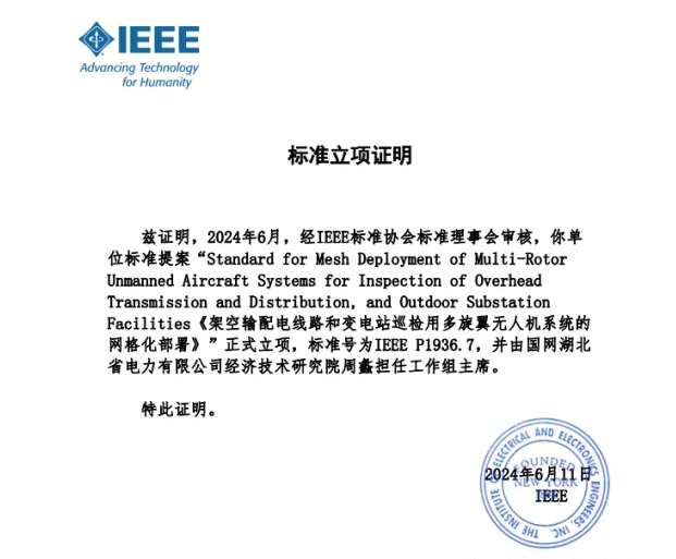 近日,从国际电气和电子工程师标准协会新标准委员会发布立项投票公告获悉,由湖北省电力企业服务协会理事单位——国网湖北经研院牵头申报的IEEE国际标准《架空输配电线路和变电站巡检用多旋翼无人机系统的网格化部署》获新标准委员会批准成功立项。