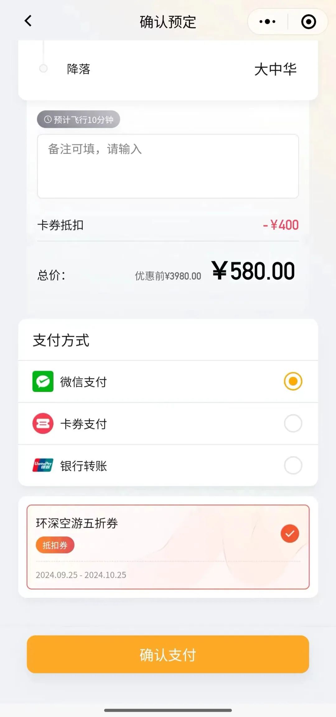 4. 到达支付界面,自动抵扣卡券费用,点击【确认支付】即可支付,支付后生成订单信息。