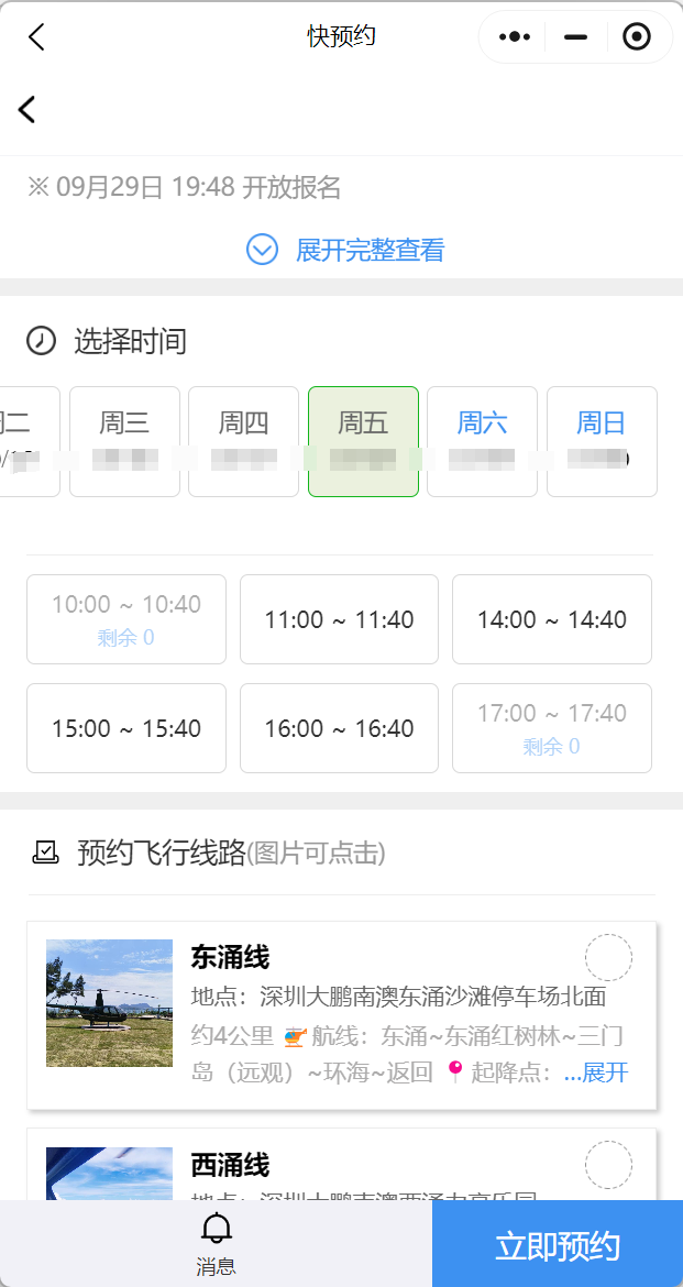 可预约飞行时间:10:00-12:00,14:00-17:30