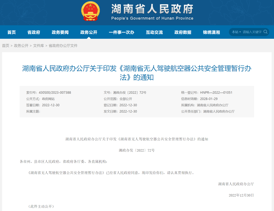 2022年12月30日,湖南省政府官方发布了关于印发《湖南省无人驾驶航空器公共安全管理暂行办法》的通知,原文如下: